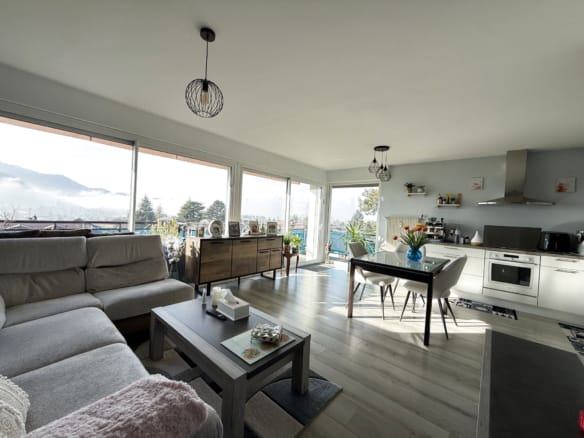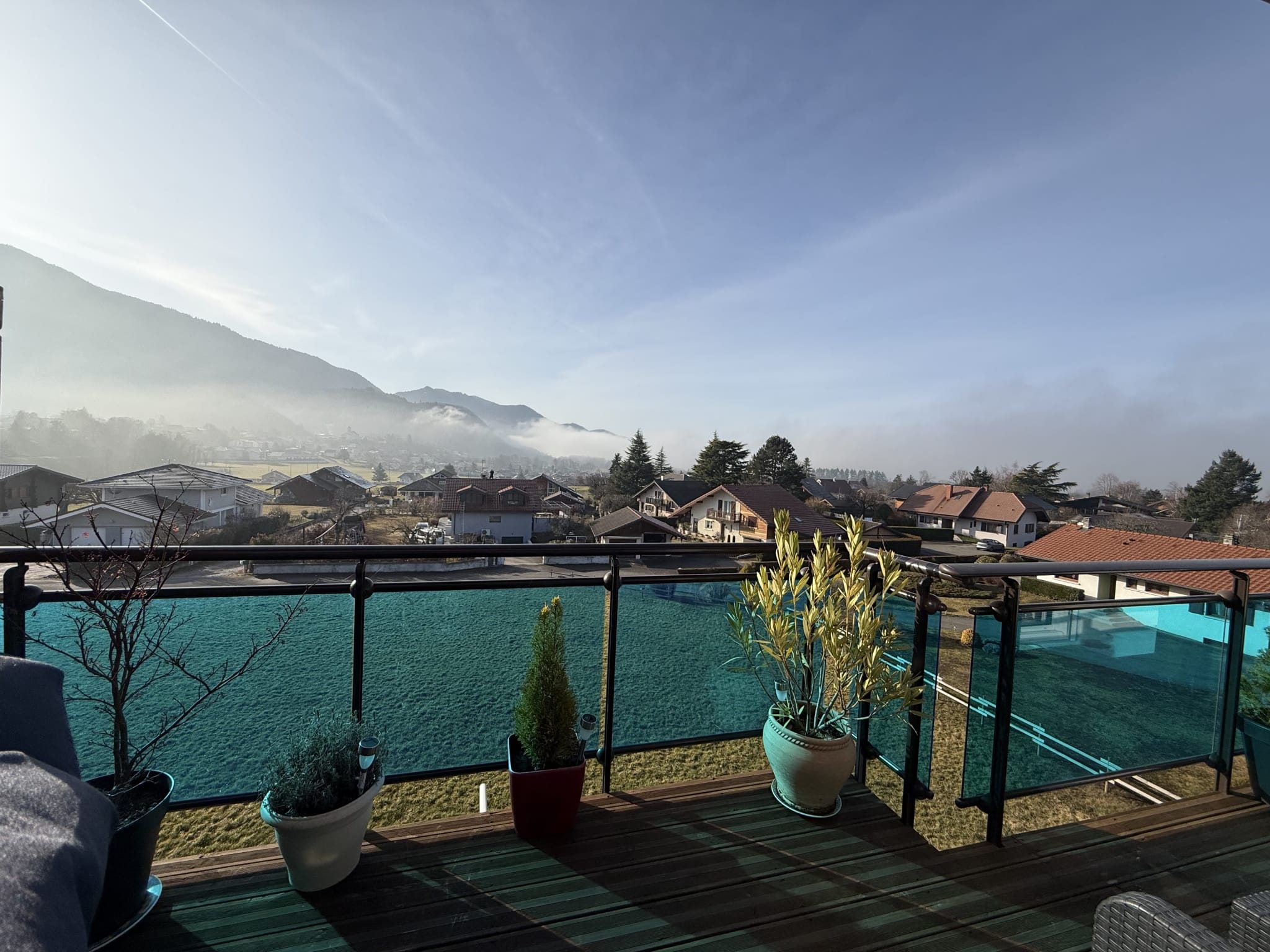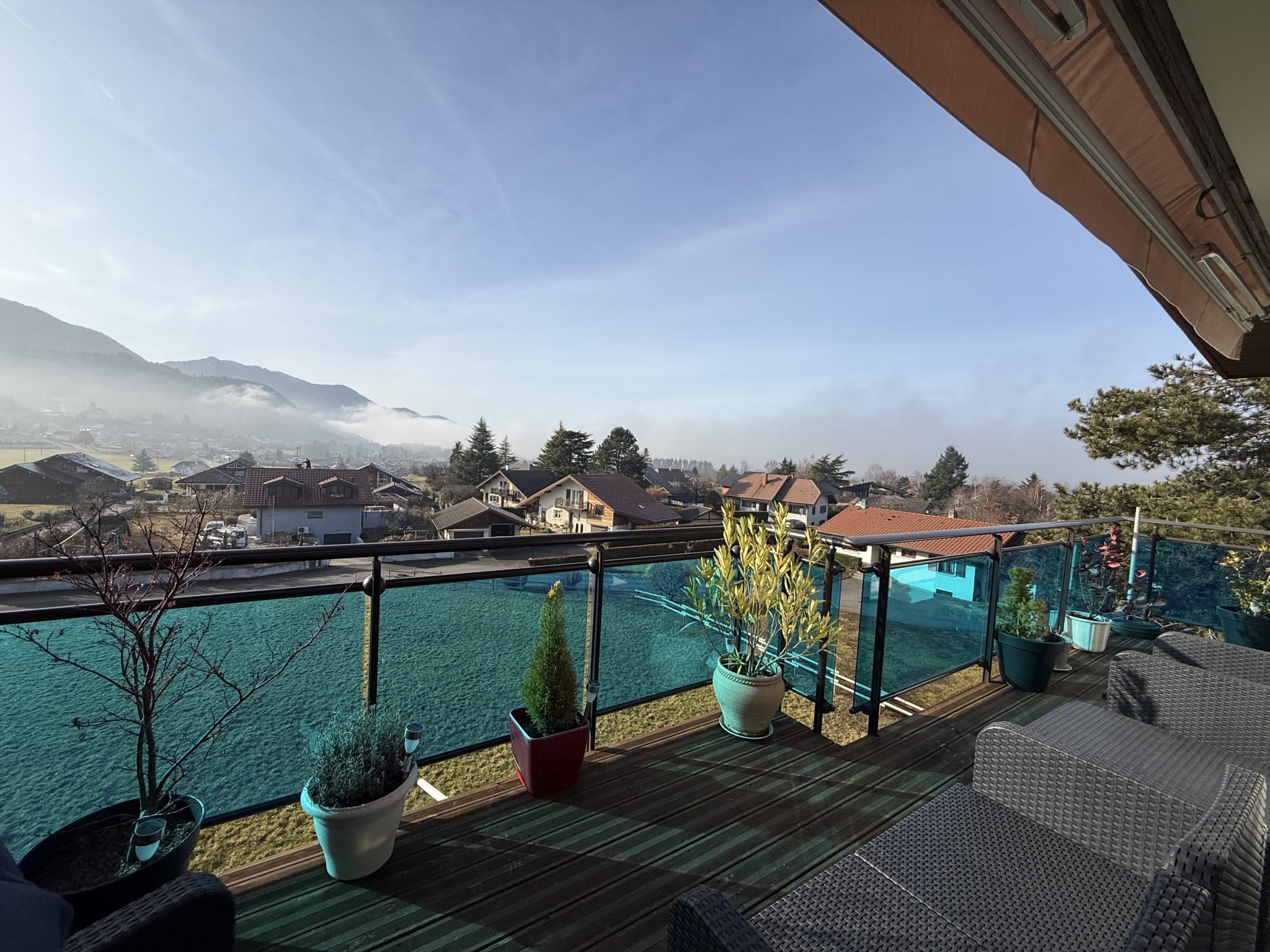 En dernier étage d’une petite copropriété je surplombe les maisons avoisinantes et offre une magnifique vue dégagée sur les montagnes.