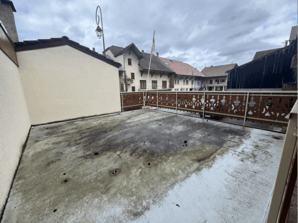 Au premier étage, une terrasse de 24 m2, une cuisine, un salon/séjour avec cheminée, une salle de bains et une très grande chambre, un balcon au Sud donnant sur le jardin privatif.