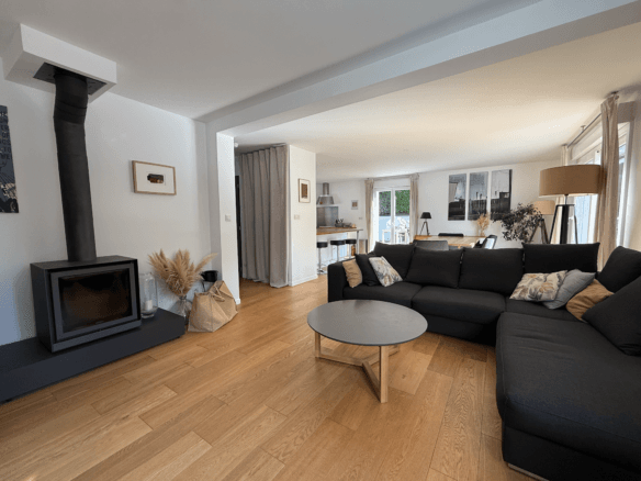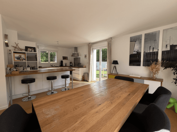 Cette maison s’articule, au rez de chaussée autour d’une grande pièce de vie baignée de soleil d’environ 50 m2 comprenant une cuisine entièrement équipée ouverte sur le séjour et d’un espace salon très cosy avec son pôele à bois moderne.