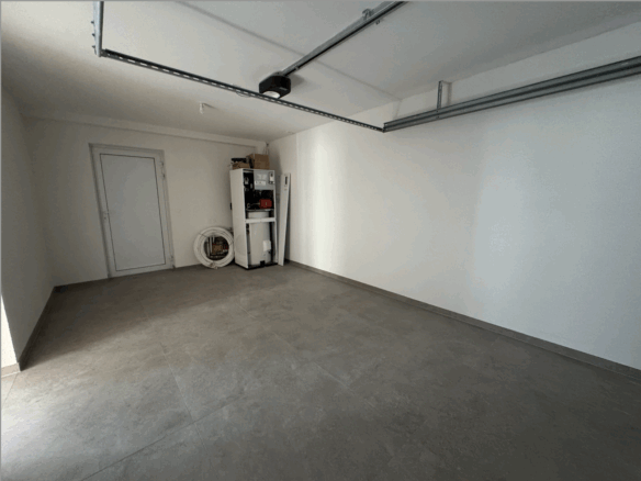 Un grand garage carrelé avec porte motorisée et une place de parking extérieure privative.